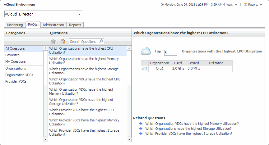 Foglight™ for vCloud Director offers a collection of frequently asked questions that provide quick insight into resource utilization levels for organization and provider vDCs in your monitored system. The question mechanism is interactive, guiding you to choose a category and specify additional parameters.