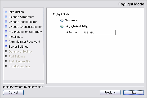 On the Foglight Mode page of the installer, select HA (High Availability) as the server startup mode.