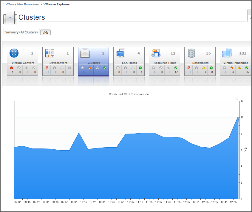 However, when you select a cluster container, the Summary tab shows a Related Objects view that lists all of the clusters in that container and provides pertinent details about each one.