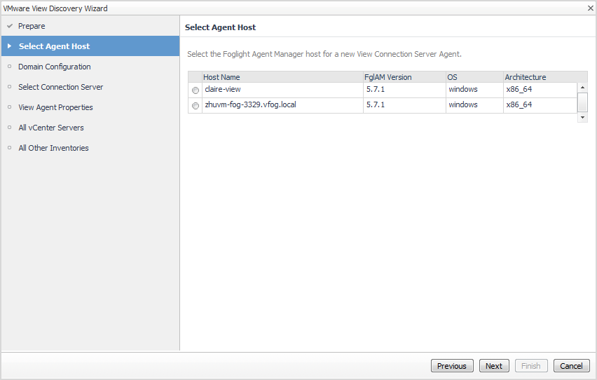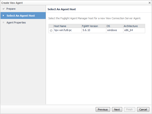 The Select Agent Host page appears. The Foglight Agent Manager host information listed on the page is from the Agent Host dashboard (Administration > Agents > Agent Hosts).