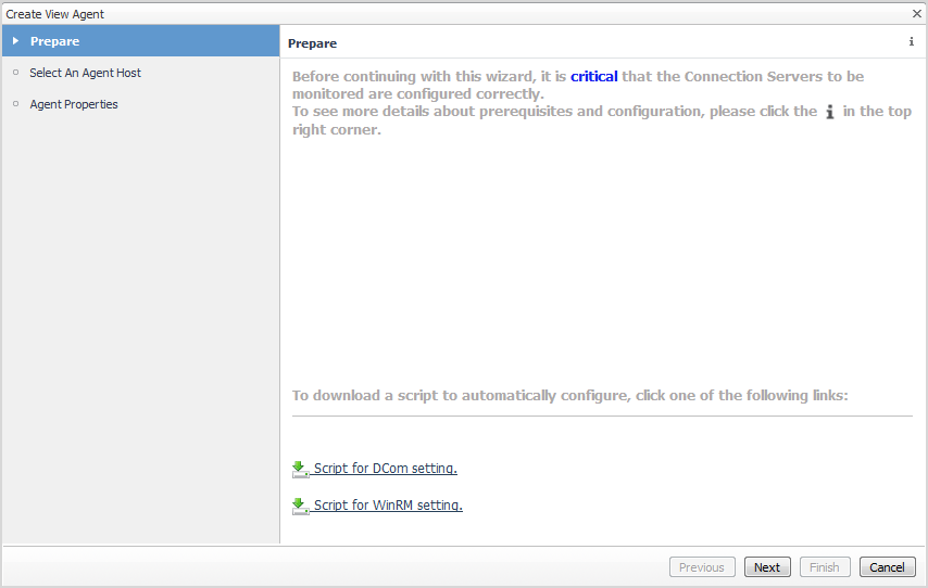 The Create View Agent wizard appears, showing the Prepare page. This page provides informations about steps that need to be taken prior to proceeding with the wizard.