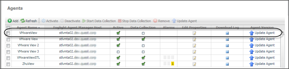 NOTE: When a newer Foglight for VMware Horizon View version is installed on your system, the Agent Version column in the Agents table is updated to read Update Agent. To apply the new features, you need to update the agents to the latest version. You can upgrade the agents one by one, by selecting each from the table and clicking the corresponding Update Agent link in the Agent version column; you can upgrade all agents at once by selecting all of them in the list and clicking the Update Agent button at the top of the list.