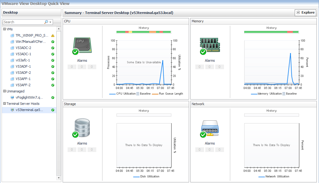 Selecting a Terminal Service Host or an Unmanaged Desktop on Physical Host from the Quick View list displays the CPU, Memory, Network, and Storage utilization charts for the selected host in the Summary pane. Clicking any data series on the charts allows you to drill down into the Metric Analyzer dashboard for the associated metric and view the metrics collected for that topology object. Click the Explorer link in the upper-right corner to drill down to the Host Monitor page for the selected host.