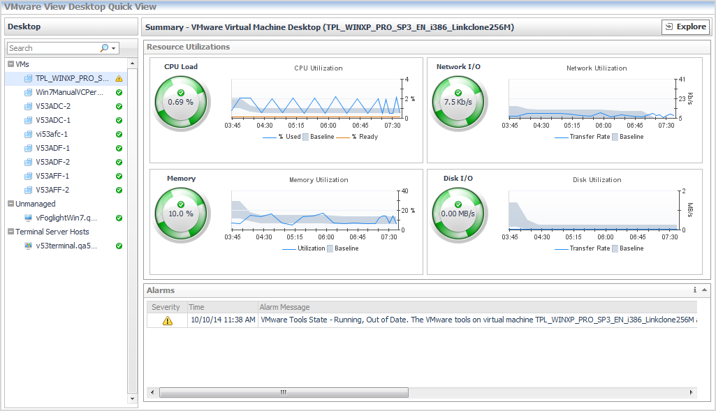 Selecting a Virtual Machine from the Quick View list displays the resource utilization values for that VM in the Summary pane. Click the Explorer link in the upper-right corner to drill down to the VMware Explorer view of the object, to see detailed information about the selected object and its components. If the selected object is a monitoring VM, the VMware Explorer page appears. For more information, see Use the VMware Explorer.