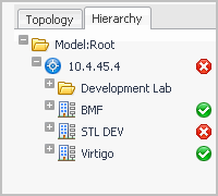The Virtual Infrastructure view contains a navigation tree on the Topology tab that represents the various virtual infrastructure objects: Virtual Centers, Datacenters, Clusters, ESX Hosts, Resource Pools, and Virtual Machines. For each individual object or group of objects, a status indicator appears, showing the alarm of highest severity that is outstanding for the that object or objects. For example, there are 25 virtual machines configured for a vCenter. Twenty of the virtual machines have a normal status, three have a warning status, and two have a critical status. In the Topology view, the virtual machines container for that vCenter displays a critical status indicator to show that at least one of the virtual machines associated with the vCenter has an outstanding critical alarm.