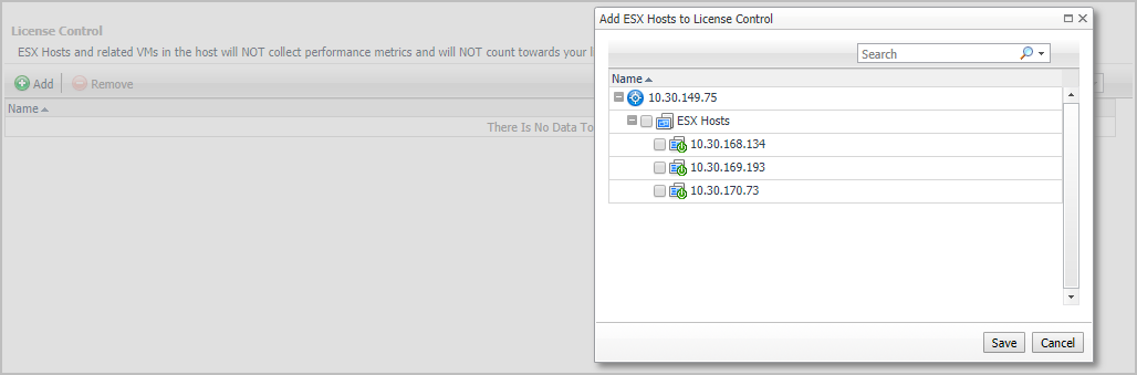 The License Control tab is used to manage license usage for ESX Hosts. The ESX Hosts and related VMs in the host added to the license control list will not collect performance metrics and will not count towards license usage.