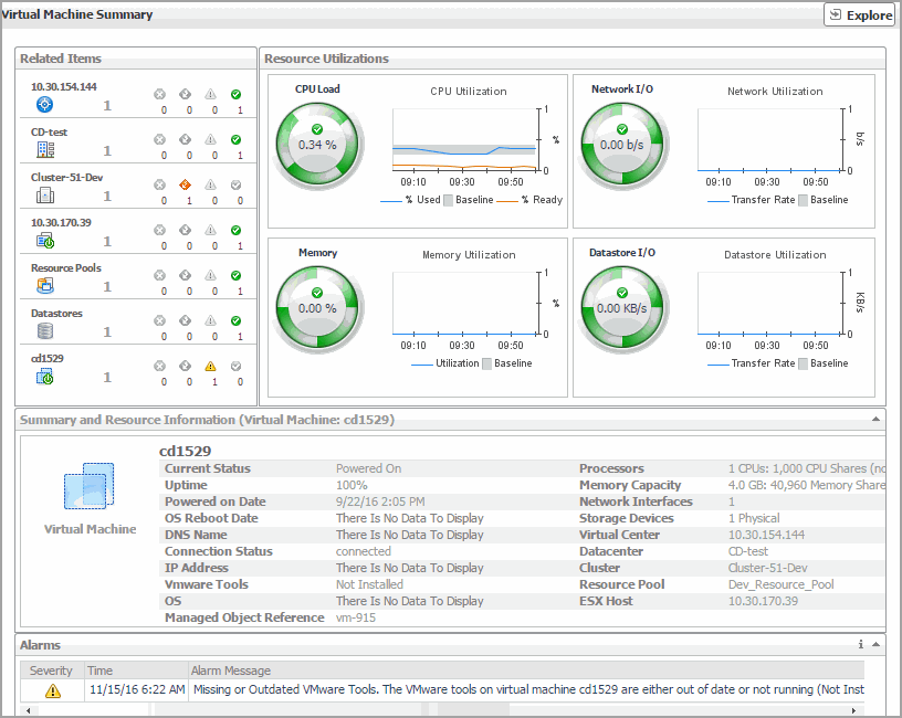 Resource Pools. The number of resource pools that are associated with the selected virtual machine, followed by the related alarm counts. | |