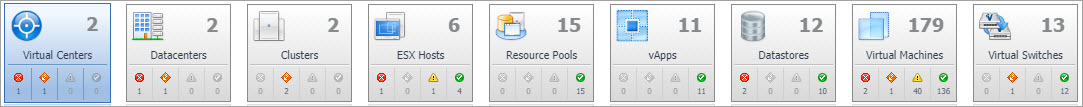 The overview has a tile for each type of object in your virtual infrastructure. Each tile shows the number of instances the corresponding object type that exist in your virtual infrastructure, as well as the count of objects of that type in each of the alarm states (Normal, Warning, Critical, Fatal).
