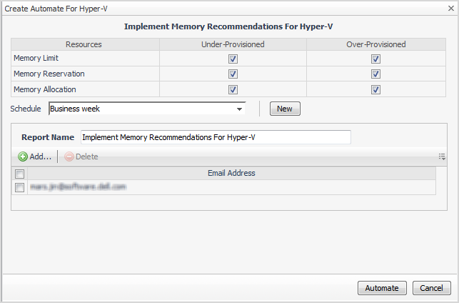 All the executable recommendations for improvements in resource utilization from the selected tab can be implemented automatically. When you click Automate, these recommendations are scheduled for implementation at a particular time in the future, and the scheduled recommendations appear in the Scheduled Actions dialog.