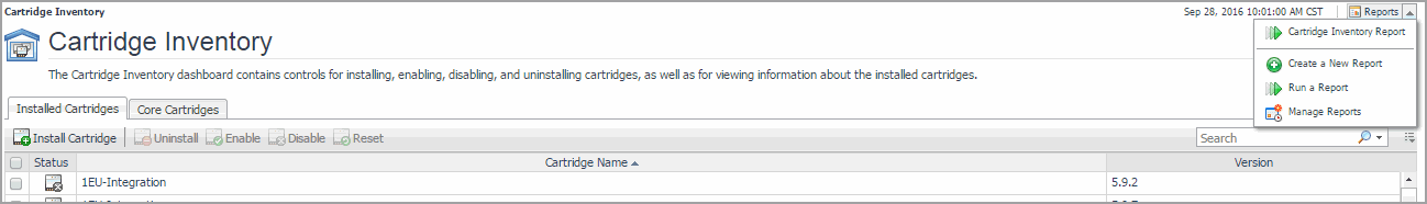 The Cartridge Inventory dashboard lists the cartridge that exist in your system and contains controls for installing, enabling, disabling, and uninstalling cartridges.