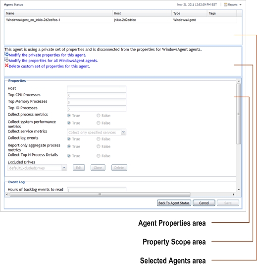 The Agent Status dashboard allows you to choose the scope of the edit operation and edit the properties of an agent instance, or of all properties of that type. Its Property State column allows you to quickly identify the agent instances that have custom properties assigned to them.