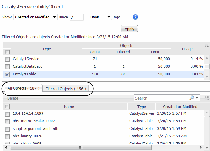 The following walkthrough demonstrates how to locate and manage stale types based on the default settings provided. In this example, we are using Catalyst Serviceability Object as the type with too many objects.
