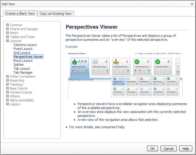 Configure the container by filling in the required fields in the editor pane. The fields for any particular view are described in the Web Component Reference help pages. The Web Component Tutorial contains an introductory example of creating a container and various views for a dashboard. |