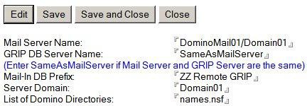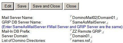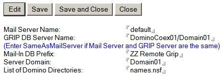 This field contains the name of the Domino Server which houses the Remote GRIP database that services one or more Domino Mail Servers. The full Hierarchical Name of the GRIP Server must be entered; however, the field may also contain the reserved keyword "SameAsMailServer", which implies the same value as that of the Mail Server. For the Local Settings document, this field is ignored and can be left blank.