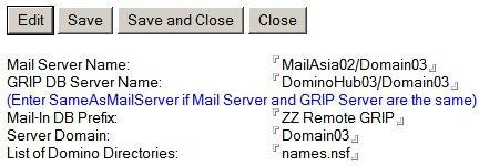 This field contains the prefix of the Mail-In Database associated with this Settings document. (Each GRIP Database in your GRIP subsystem must have an associated Mail-In Database. We will discuss this later.) The prefix will be concatenated with the common name of the Domino Server to provide the full name of the Mail-In Database. Although the prefix for each GRIP database may be different from one another, it is recommended to use the same value for all and simply distinguish the Mail-In Database names by the common name of the Domino Server (shown later in the document). It is further recommended that the Mail-In DB Prefix for the Local Settings document be “ZZ Local GRIP”, and the Mail-In DB Prefix for all other Settings documents be “ZZ Remote GRIP”.