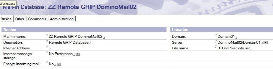 In this scenario, since each Domino Mail Server contains a Remote GRIP Database, you must define a Settings document for each Domino Mail Server. For our purposes, let’s assume we have two Domino Mail Servers (DominoMail01 and DominoMail02), both residing in Domain01. In this case, you would define the following two Settings documents:
