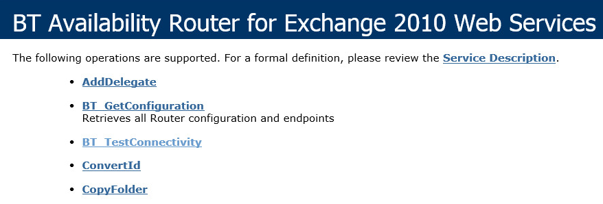 1. The BT Availability Router for Exchange 2010 Web Services page should appear: