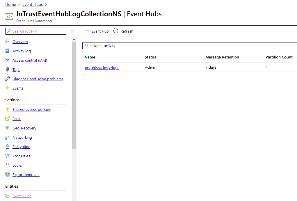 Azure logs are collected through communication with Azure event hubs. A specialized Azure Knowledge Pack component on the InTrust server is responsible for connection to the specified event hub and retrieval of events from it.