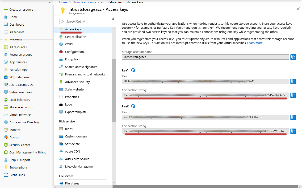 3. Copy the values in the Connection string–primary key and Connection string–secondary key text boxes and save them for later use.