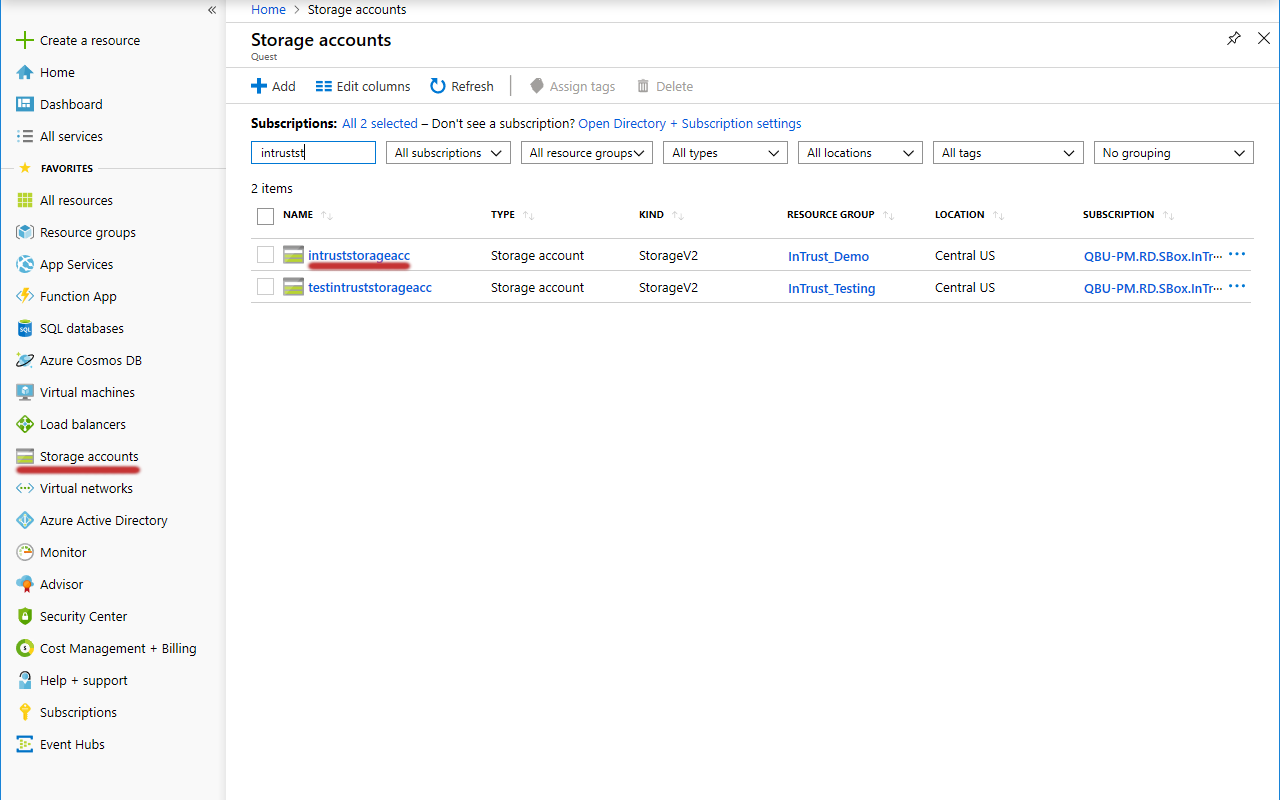 2. In the list of storage accounts that appears, select the one you need. Choose an account where: