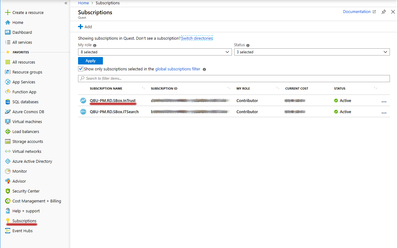 3. Copy the value in the Subscription ID column of the table and save it for later use.