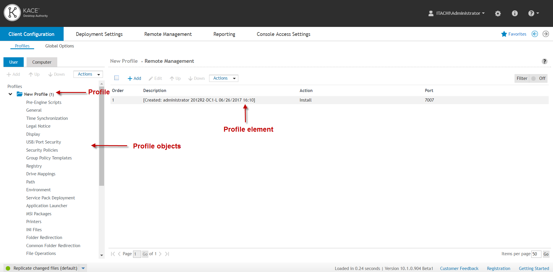 To create a profile, first choose either the User or Computer tab. Select the level of the profile tree where the profile will be created. For a parent or top level profile, select the Profiles level in the tree. For a child profile, select the parent profile it will be created within. Next click the Actions drop list and select Add. A new profile will be created at the level you selected. It will be temporarily named New Profile. Type over the profile name and give it a more meaningful name. You can then expand the profile to reveal the profile objects.