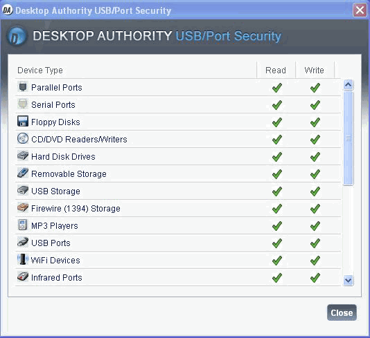 USB/Port Security continually watches the system in order to secure the various devices/ports against the use of restricted devices on the company network. Clients can be notified via a popup warning upon the attempted use of a restricted device. If the system tray is not hidden from the client, permissions can be viewed via the system tray icon.