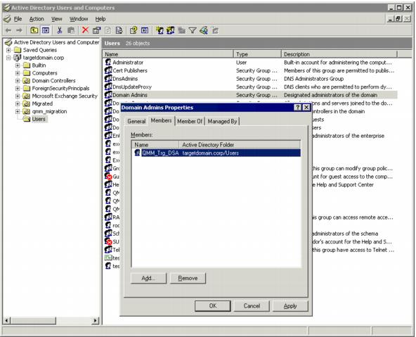 - Go to the Members tab, click Add and select the Target Active Directory Synchronization Account (in our example, QMM_Trg_DSA).