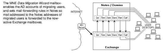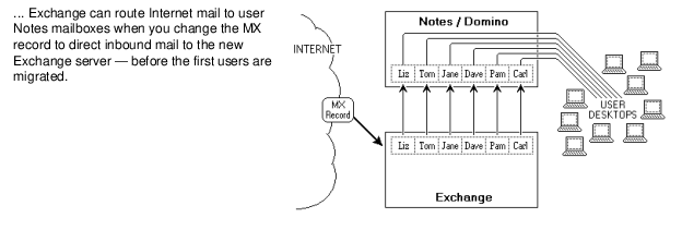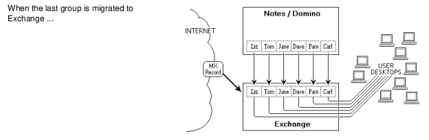 Users in this scenario are migrated in a series of collections (user groups) over a period of weeks, so you will require an email coexistence strategy that permits mail-forwarding throughout the transition period—when some users have already been migrated to Exchange while others wait their turn back in Domino. If you choose the SMTP method of mail-routing and want a single-domain approach, you would configure a smart host for each environment. (All of the coexistence methods and their alternatives are summarized in the Migrator for Notes to Exchange Pre-Migration Planning Guide.) When the SMTP mail-routing is configured, you modify the MX (Mail eXchange) record to direct external (Internet) mail to the Exchange environment. Since no users are yet migrated but all users are provisioned and mail-enabled in Active Directory, for now all inbound Internet mail is routed back to the corresponding Notes mailboxes.