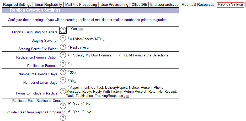 The Replica Settings are used when using a Domino staging server. A staging server is often used when the Domino mail servers are not on the same LAN as Exchange and/or the migration environment to mitigate migration throughput degradation due to the network. Staging servers are also used if you will be using replication formulas to filter the data intended for migration.
