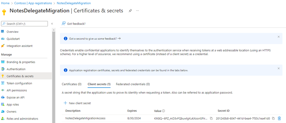 After adding the secret, the Value for the secret will be displayed. Click the copy icon and save the client secret wherever you saved the application ID and directory ID or apply it directly to the Migrator for Notes Settings.