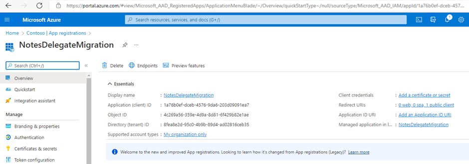 The delegation migration does require an Application (client) ID to be created in the tenant to process mailbox folder level permissions. The process to set up an Application ID can be found in the Configuring an Azure AD Application Registration section. The steps are based on Microsoft configuration at the time of release, refer to Microsoft documentation if these are changed.