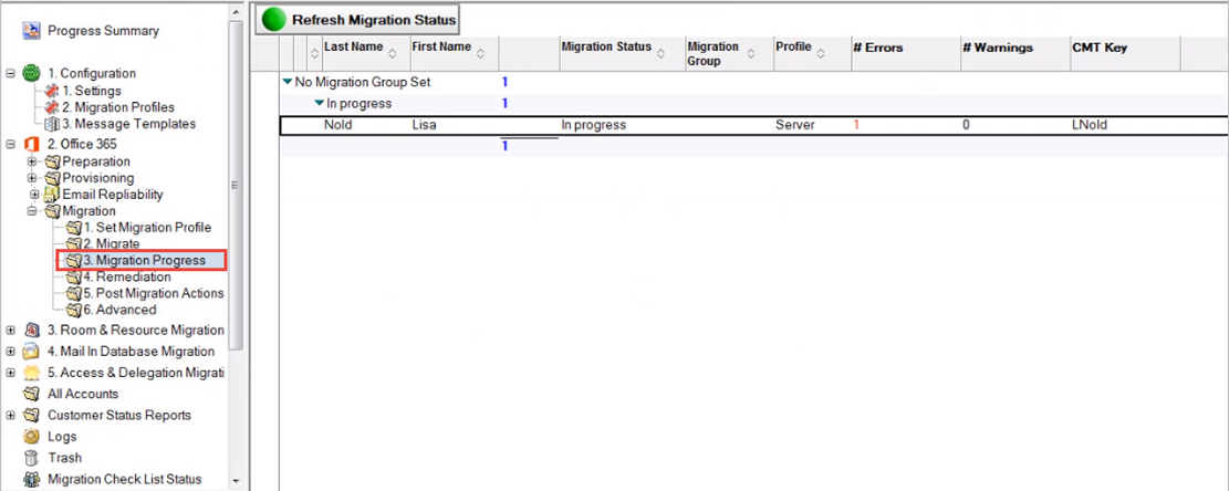 2. Click the Refresh Migration Status button to show the most current and accurate migration status