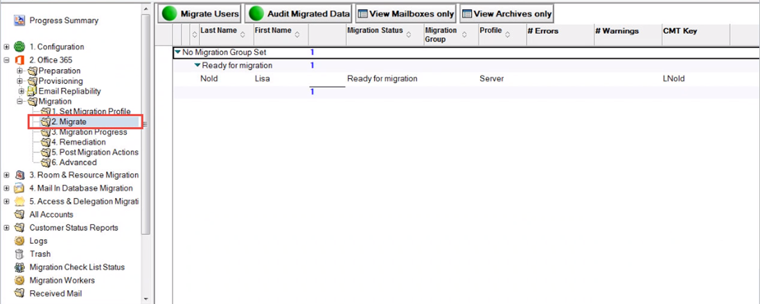 3. Select user(s) that are ready for migration, and then click Migrate Users in the Data Pane