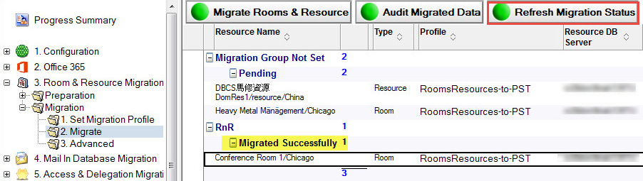 4. The Refresh Migration Status button allows you to refresh the status of the selected rooms and resources.