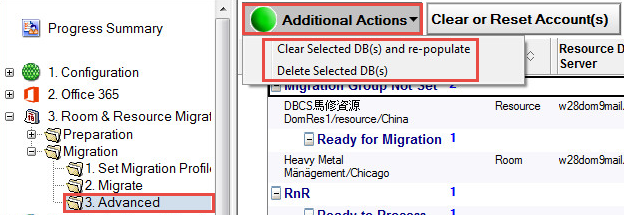 5. Before migrating, clear or delete any necessary databases; in the Advanced view, select the rooms and resources, click Additional Actions and select the appropriate drop-down menu item: