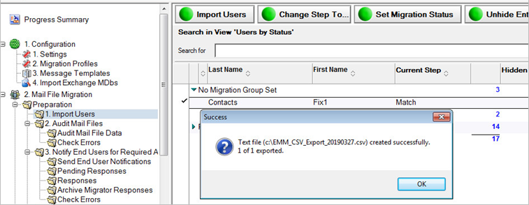 The selected account data on any view within Migrator for Notes can be exported to a text file. Once entries in the Data Pane are selected, all data, along with their corresponding column headers, can be exported to a .csv file.