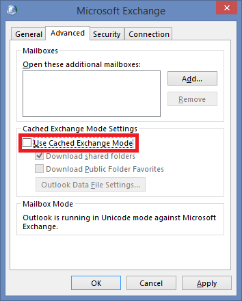 • The Outlook profiles on the Migrator Pro for Exchange migration server and migration Worker machines must have Cached Mode disabled for the migration to proceed. But note that end users’ Outlook profiles must be in Cached Mode to permit end-user viewing of O365 Groups by the Outlook client.