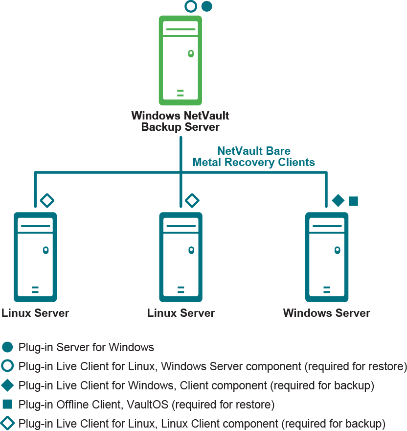 Linux용 플러그인 라이브 클라이언트, Windows 기반 서버 구성 요소는 Windows 기반 NetVault Backup 서버에 설치되고 Linux용 플러그인 라이브 클라이언트, Linux 기반 클라이언트 구성 요소는 온라인 또는 핫 백업으로 보호할 각 Linux 클라이언트에 설치됩니다.