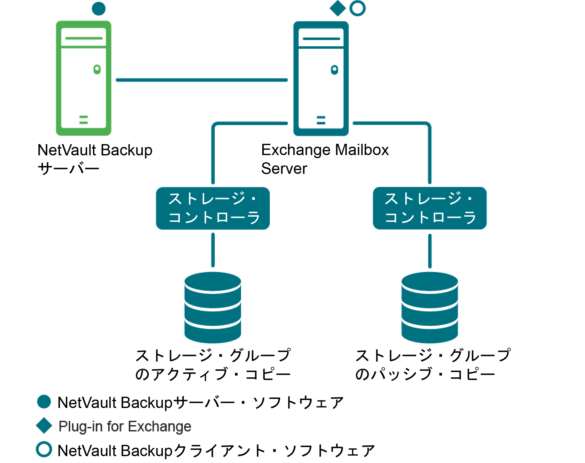 重要: 環境(NetVault BackupサーバーとExchange Serverのマシンを個別に用意するか、両方を1つのマシンで設定するか)に関係なく、Plug‑in for Exchangeは、Exchange Serverメールボックス・データベースが存在するホストにインストールする必要があります。本書の例の画像および手順では、この2台のマシン環境が設定されていて、事前要件をすべて満たしていることを前提としています。