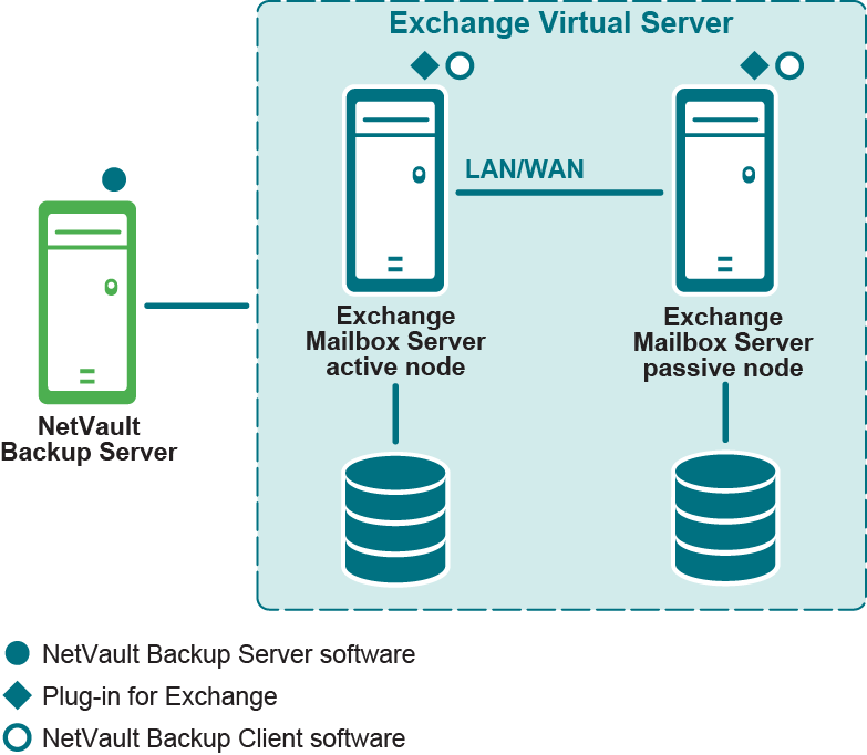 In a CCR deployment, the plug-in is installed on the Exchange Virtual Server. The Exchange Virtual Server is a group of nodes and hosts that make up the cluster. The NetVault Backup Server sees the cluster as a single client, which is called a Virtual Client. When installing the Plug‑in for Exchange on the Virtual Server, the plug-in is installed on all nodes by using NetVault Backup’s Cluster Support. NetVault Backup’s Virtual Client is used to back up either the Active or Passive node, which in this example is the Exchange Virtual Server.