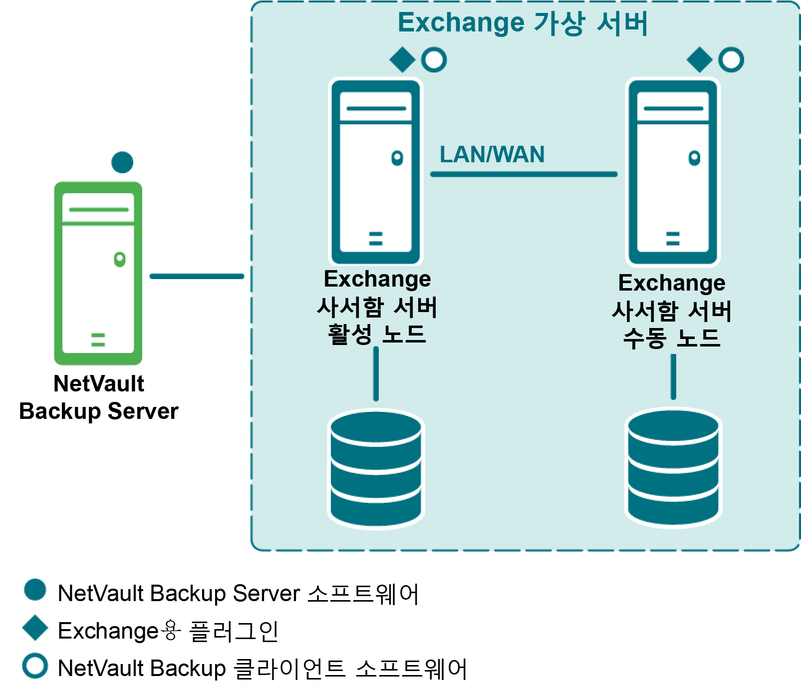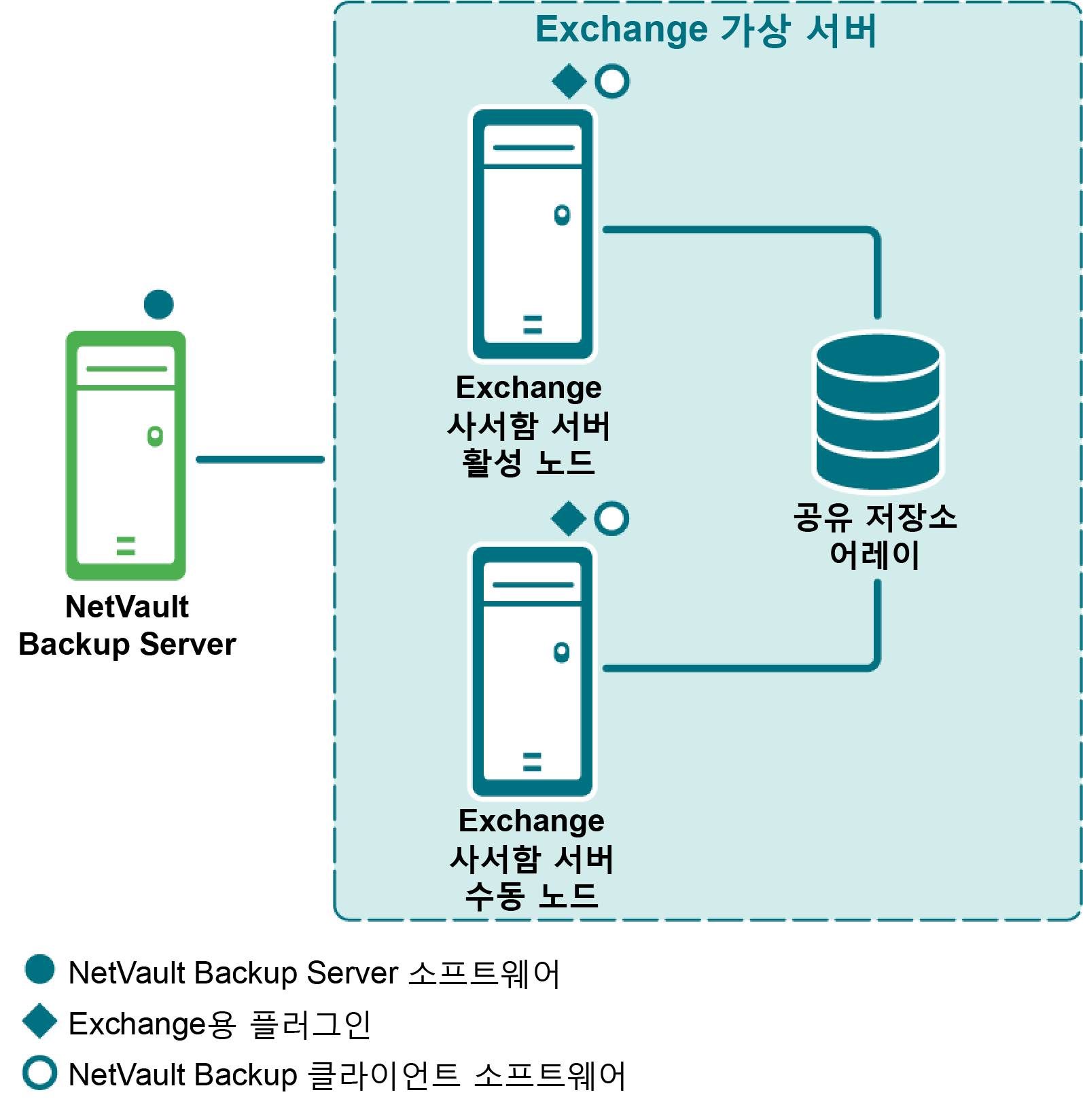 CCR 배포에서 플러그인은 Exchange 가상 서버에 설치됩니다. Exchange 가상 서버는 클러스터를 구성하는 호스트와 노드의 그룹입니다. NetVault Backup 서버는 클러스터를 가상 클라이언트라고 하는 단일 클라이언트로 인식합니다. Exchange용 플러그인을 가상 서버에 설치할 때 플러그인은 NetVault Backup의 클러스터 지원을 사용하여 모든 노드에 설치됩니다. NetVault Backup의 가상 클라이언트는 활성 또는 수동 노드를 백업하는 데 사용되며 이 예에서는 Exchange 가상 서버입니다.