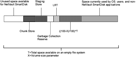 NetVault SmartDisk uses storage space in each volume up to a threshold amount that includes space directly set aside using the volume-size parameter, and the Last Resort Threshold (LRT) amount set by NetVault SmartDisk internally. |