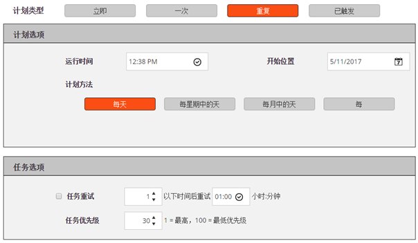 计划方法:选择计划方法,并配置所需的选项。可用的方法有:每天、周中的某些天、月中的某些天和每年。有关详细信息,请参阅 重复任务的计划方法和选项