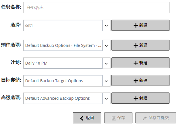 插件选项列表中,选择现有备份选项集,或者单击新建,然后配置要使用的选项。