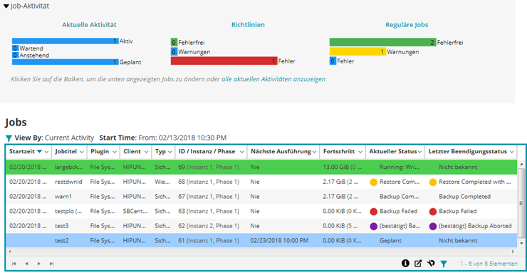 Sie können den Ansichtstyp ändern und die in der Tabelle angezeigten Datensätze filtern: Ändern des Ansichtstyps: Sie können die Jobdetails für eine andere Jobkategorie anzeigen, indem Sie im Aktivitätsdiagrammbereich auf den entsprechenden Balken klicken. Wenn Sie beispielsweise Jobs anzeigen möchten, die mit Warnungen abgeschlossen wurden, klicken Sie im Bereich „Reguläre Jobs“ auf den Balken „Warnungen“. |