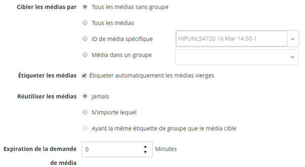 Pour étiqueter automatiquement les éléments de média vierges durant une sauvegarde, sélectionnez la case Étiqueter automatiquement les médias vierges.