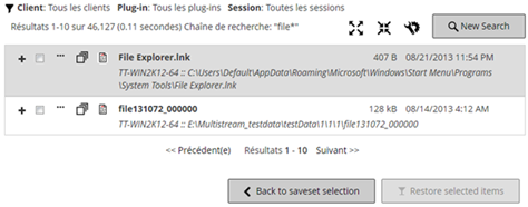 L'option Rechercher dans la page Créer une session de restauration : sélectionner l'ensemble de sauvegardes permet de rechercher des fichiers ou des données spécifiques sans ouvrir d'ensembles de sauvegardes ni parcourir leur contenu. Vous pouvez utiliser des noms de fichier ou des expressions régulières pour rechercher les données que vous souhaitez restaurer.