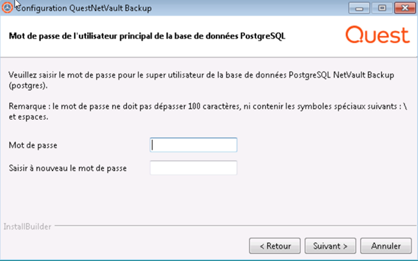 Pour plus d'informations sur la manière de définir un mot de passe super utilisateur de la base de données PostgreSQL, voir Détermination du nom et du mot de passe NetVault Backup.