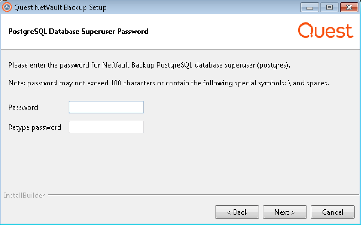 有关指定 PostgreSQL 数据库超级用户的密码的详细信息,请参阅确定 NetVault Backup 名称和密码.